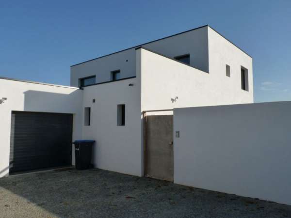 Conception d'une maison familiale d'esprit contemporain. La parcelle est de forme tordue, ce qui implique une certaine complexité dans l'élaboration du projet. La recherche a porté comme souvent et avant tout sur la recherche de la meilleure orientation pour que l'habitation bénéficie d'apports solaires optimaux. Par ailleurs, cette maison s'ouvre sur un jardin principal avec piscine, tandis que deux patios permettent d'aérer le volume et d'offrir de la lumière naturelle à chaque espace de la construction. L'étage débordant au Sud offre une protection solaire naturelle au dessus des importantes baies vitrées de la pièce principale. L'étage se compose de deux chambres précédées d'une mezzanine s'ouvrant simultanément sur une terrasse accessible et sur un vide sur la pièce de vie. Le double volume a permis la création de haute baies vitrées fixes qui apportent de l'ensoleillement au niveau des patios.