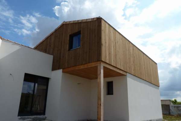 Il s'agit d'une maison individuelle pour une famille avec 4 enfants. L'architecture met en avant l'utilisation du bois, associée à une orientation très favorable pour les pièces de vie. La parcelle provenant d'une division a influencé l'architecture. Le volume de plein pied est entièrement en bois et le volume avec étage associe un niveau d'accés en maçonnerie et un étage en ossature bois. Le garage est également réalisé en maçonnerie.L'apport en inertie de l'utilisation du béton apporte beaucoup au niveau du rendement énergétique de la maison.
